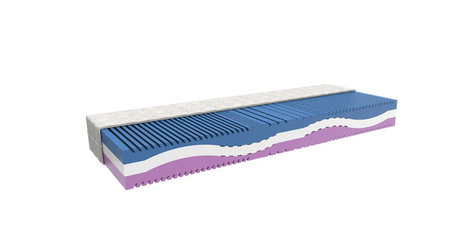Moderní a velmi komfortní matrace z eukalyptových, příčně profilovaných pěn s otevřenou buněčnou strukturou pro stálou cirkulaci vzduchu a odvod vodních par vzniklých pocením.