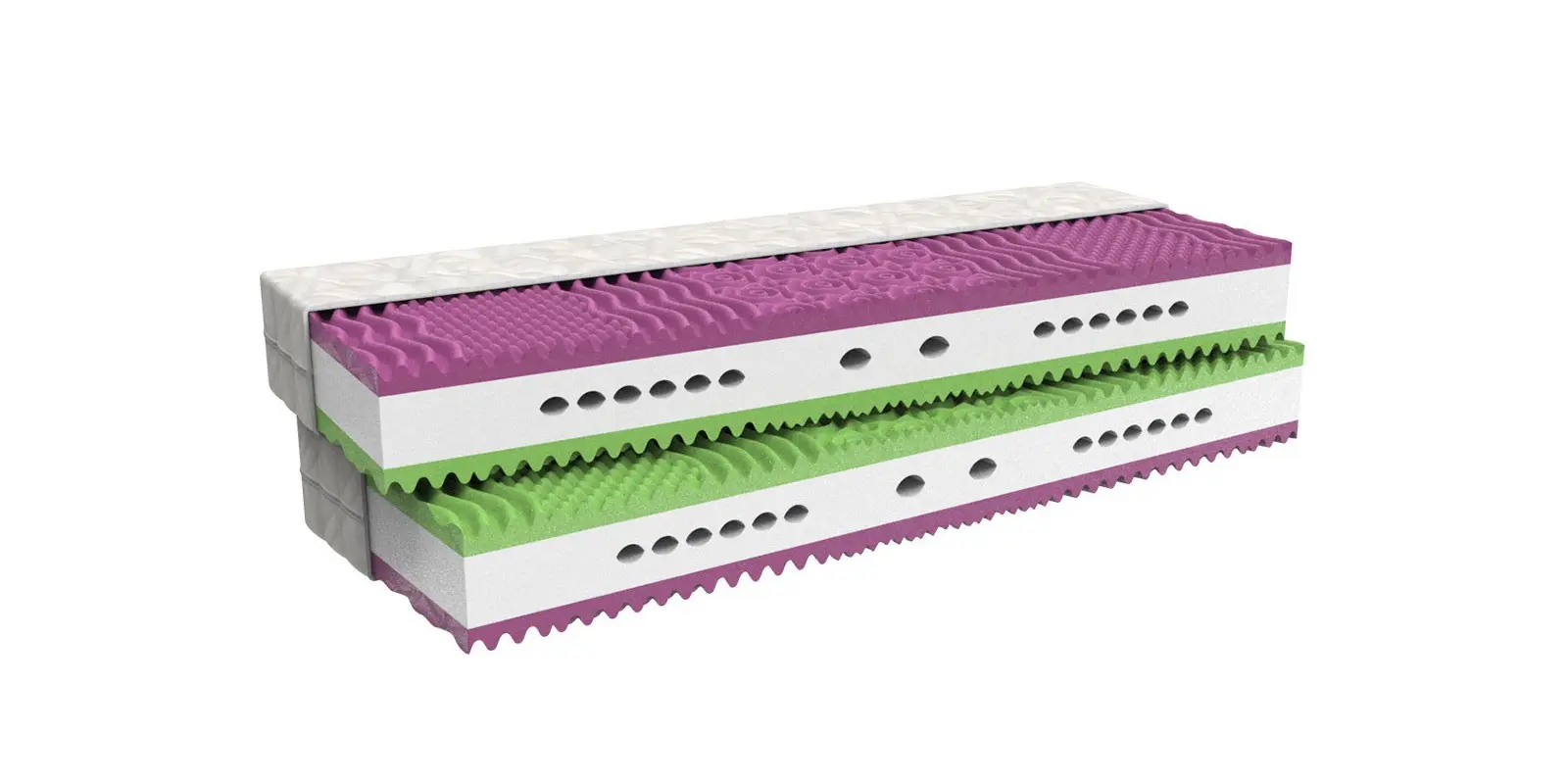 Partnerská 7zónová matrace 1+1 Veronika s nosností 110 kg a výškou 18 cm má měkčí a tvrdší stranu i oboustrannou ramenní kolébku. Je vyrobena z kvalitní PUR pěny.