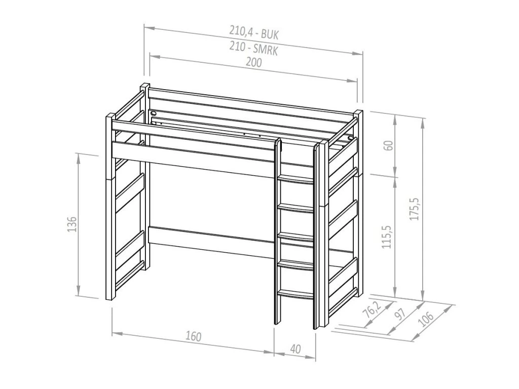 • výška uložení roštu: 141,5cm Pro dodržení bezpečnosti je nutné použít laťový rošt a matraci s maximální tloušťkou 15cm. Prostor podlůžkem: 136,5cm